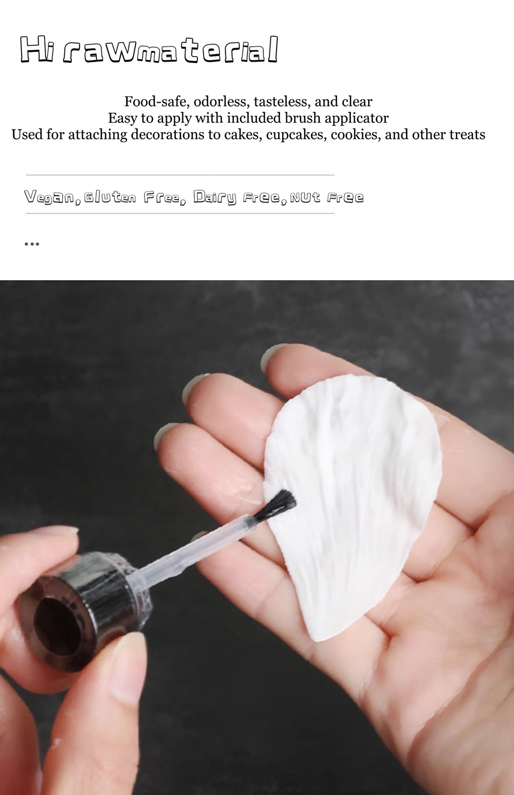 Key features of our baking glue:Strong Adhesion/Quick Drying/Food Safety/More versatile Applications etc...Also customizable glue of various flavors.